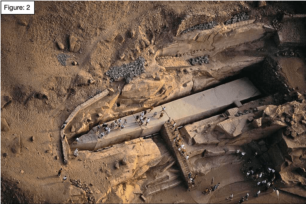 Some of the blocks in the Valley Temple are over 60-80 tons. To not only move, but to immaculately carve out and remove such blocks from the limestone sphinx enclosure with stone-age technology (granted there would have been tremendous casualties in slave labor), is just physically impossible. Granite is a very hard stone; andesitic granite featured all around the Giza complex is largely from the Aswan quarry which is over 500 miles away. How could such massive megalithic blocks, such as the 1,200-ton unfinished obelisk at Aswan, Egypt (fig. 2) and those already in place at Giza have been moved in their entirety across such far distances? Why build things in such a massive scale in the first place? The sphinx has clear signs of reconstructions. Its head is not original from the time of its genesis. It is likely that the sphinx had an even larger megalithic head, some pose it was the god Anubis, others the god Sekhmet. Either way, it is possible that the original head fell or was damaged by the cataclysms 12,000 years ago and then during dynastic post-deluge times then carved out by the most killed slaves during the pharaonic age. There were no pharaohs in ancient Egypt. Ancient Egypt; Khemit/kemet existed during pre-deluge times, when humans used technology that is of source and the earth was in a golden age. For the last 10,000 years, humans have been in a sort of dark age. It is nearing an end; a cyclical troph, and has perhaps recently reached it during the conjunction between Jupiter and Saturn.